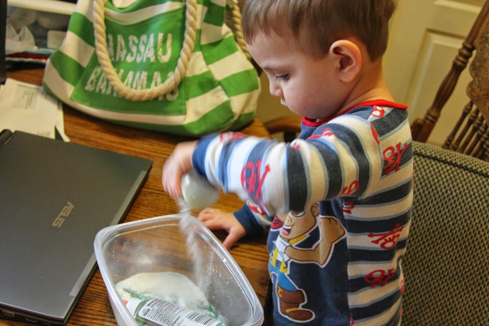 Then we added food coloring and glow in the dark glitter...A little tip: don't try to capture the glitter pouring on camera if you have a child who loves pouring and want any of that glitter left over.